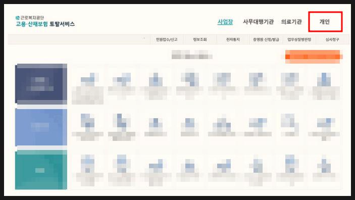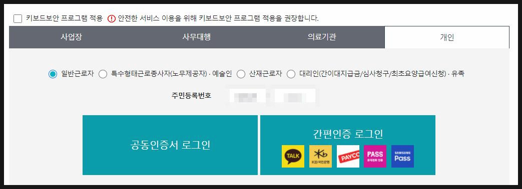 고용 산재보험 사이트에 들어오셨으면 이 화면이 나올 겁니다. 화면 오른쪽 상단에 개인이라는 곳을 클릭하셔서 들어가시면 돼됩니다. 들어가게 되면 로그인하는 화면이 나옵니다. 여기에서 주민등록 번호 넣으시고 인증서 로그인하시면 됩니다.