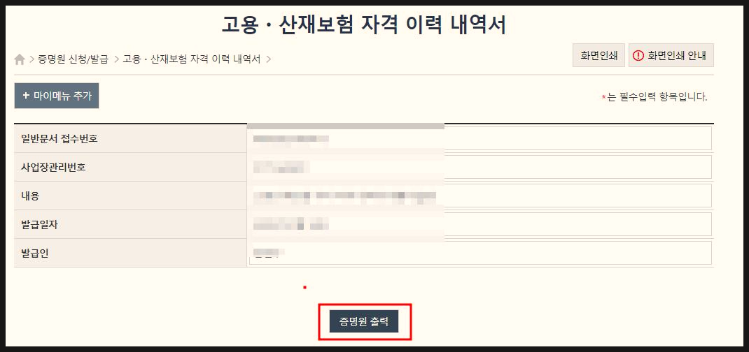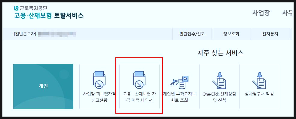 인증을 완료하셨다면 이 화면이 보일 겁니다. 여기에서 고용. 산재보험 자격 이력 내역서를 클릭 후 들어가시면 됩니다. 보험 구분에서 고용. 산재보험 자격 선택하여 조회하시면 됩니다