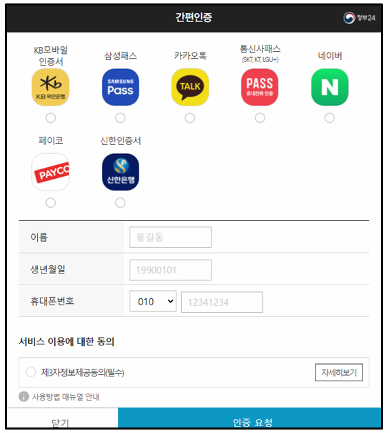 위에서 말씀드린 것처럼 간편 인증, 공동. 금융 인증서가 있습니다. 그러면 저는 간편 인증을 통해 한번 신청해 보겠습니다.