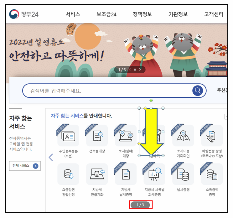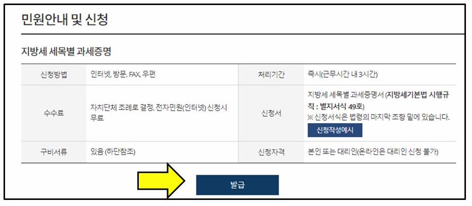 화면 보시면 제일 첫 화면입니다. 사진에 보시면 지방세 세목별 과세증명 보이시죠? 노란 화살표 밑에 클릭해주세요