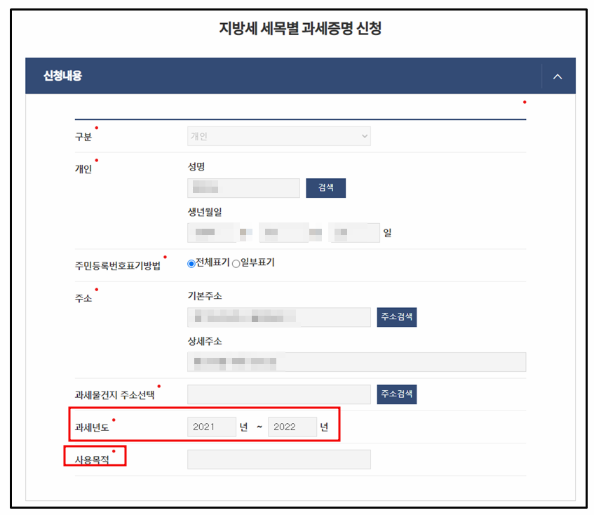 앞에 인증을 하여 로그인하셨다면, 이 화면이 나오실 겁니다 과세 연도는 2021년부터 2022년 까지이며, 사용 목적은 연말정산이라고 저는 작성하였습니다. 여기까지 전부 작성을 하셨다면 아래 화면이 나올 겁니다.