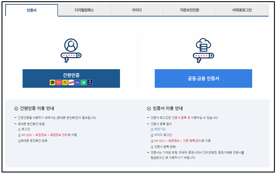 인증은 간편 인증이나, 공동. 금융 인증서로 로그인이 가능합니다. 없다고 안되는 거 아닙니다 없는 분들은 이름, 주민등록번호, 연락처 등 입력하여 확인하실 수 있으니깐 걱정하지 마세요