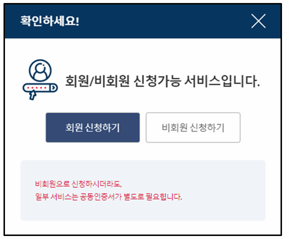 발급을 누르시게 되면 회원으로 신청하는 방법이 있고, 비회원으로 신청 하는 방법이 있습니다. 두 방법 중 편하신 방법으로 신청해주시면 됩니다. 이렇게 하면