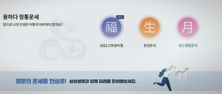 어느덧 2021년이 다 지나가고 새 해가 시작되려 합니다. 삼성생명 무료운세 코로나는 여전히 성행하고 있지만 그래도 백신 등 조금씩 해결책이 마련되고 있는 것 같아서 희망을 가져보곤 하는데요. 2022년에는 지난 2년보다 조금 더 활기찬 하루하루를 보낼 수 있기를 바라는 마음에 삼성생명 무료운세를 봐봤어요.