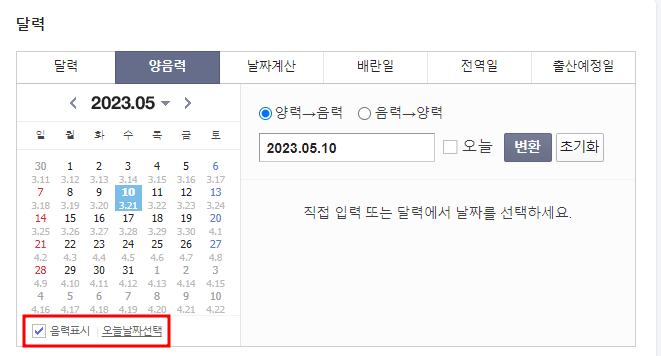 1. 원하는 날짜 양력에서 음력으로 변환 가능
