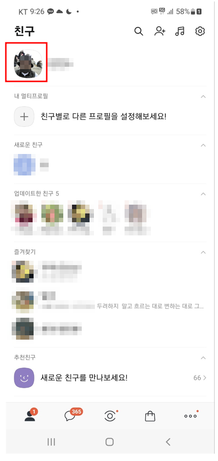 1.먼저 휴대폰 상에서 카카오톡 앱을 실행시킨 뒤 친구 목록 메뉴 가장 위에 있는 자신의 프로필을 선택합니다.