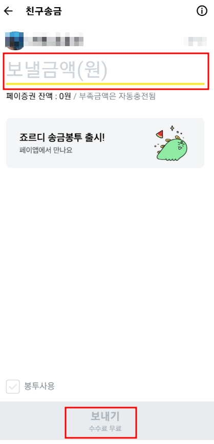 3. 송금할 금액 작성 후 보내기, 봉투 사용도 가능