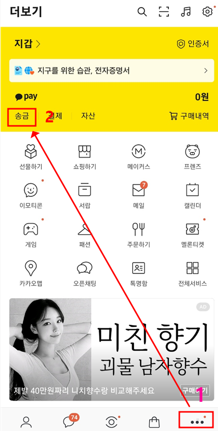 아래 화면 처럼 점 3개 누르신 후 위쪽 왼쪽에 보시면 송금이라는 게 있습니다.