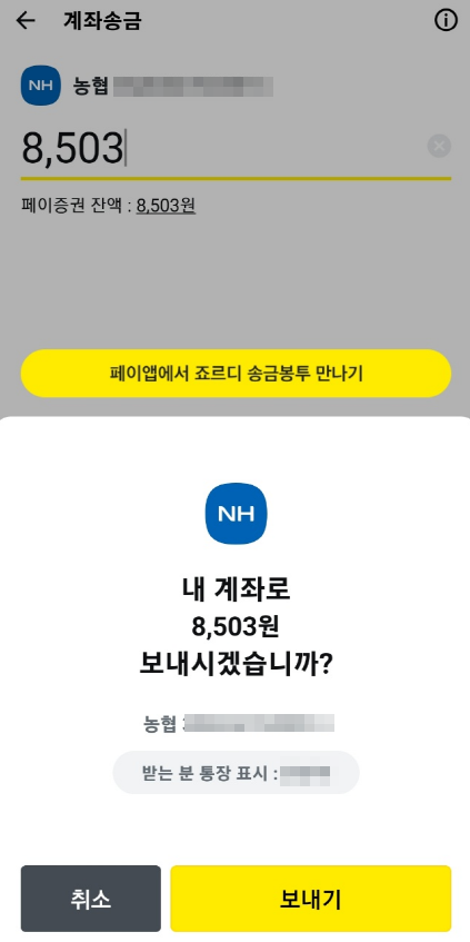 송금을 누르게 되면, 은행선택 농협, 카카오 뱅크부터 다 나옵니다. 계좌 번호 입력 후 확인 누르 시면 원하는 계좌 이체됩니다. 여기서 중요한 점 하루 10회는 수수료 없는 무료 입니다.