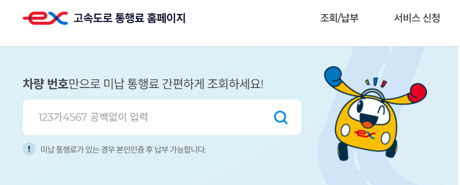 차량 번호만 입력 후 조회 버튼을 눌러 아주 쉽게 하이패스 미납요금 조회가 가능합니다.