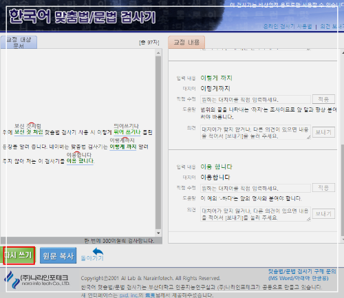접속 후 자유롭게 이용할 수 있습니다. 한 문장 검사 후 다시 검사 할 때는 다시 쓰기를 누르시고 이용하시면 됩니다.