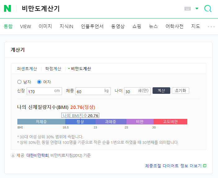 그러면 우리가 기다리는 비만도 계산기는 어디서 어떻게 봐야 하는가? 바로 네이버 검색창에 "비만도 계산기"라고 검색하시면 바로 쉽게 찾을 수 있습니다. 성별, 신장, 체중, 나이를 입력하시고 결과를 보시면 됩니다