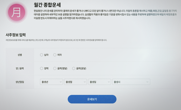 생각보다 매우 다양하기 때문에 궁굼한 부분이 있다면 하나씩 직접 해보는 것도 재미있는 결과가 나올 텐데요. 신토정비결을 보기 위해서는 내 성별과 생년월일, 시간을 적어야 합니다. 정보를 입력하면 자신의 운세를 확인하실 수 있지요. 생각 보다 굉장히 전체적인 부분에 대해 운세를 다루고 있으며, 이런 쪽으로 관심이 있는 분들은 대체로 매우 만족해하시더라구요.