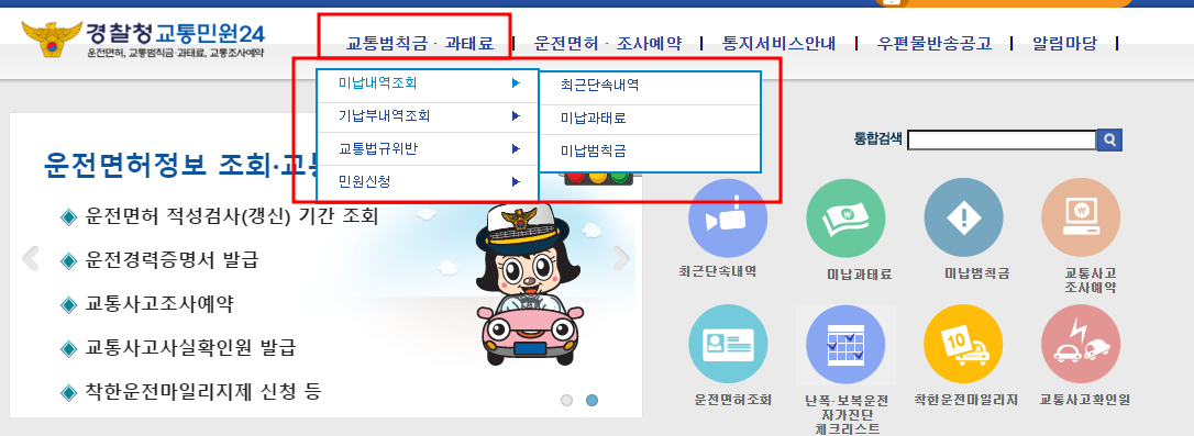 -교통범칙금. 과태료 >> 미납내역조회으로 이동하셔서 확인 가능 합니다.