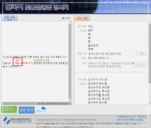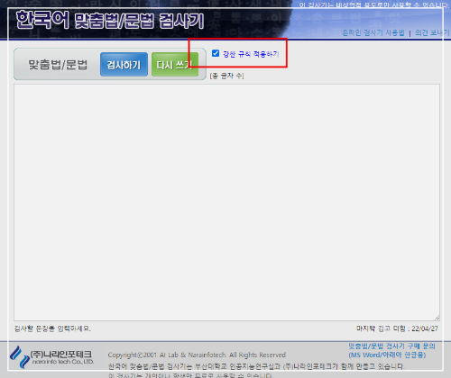 이런 거 빼고는 저는 한국어 맞춤법 검사기는 부산대학교에서 개발한 이 프로그램이 가장 우수한 거 같습니다. 개인적인 생각이지만 매우 만족하며 사용하고 있습니다.