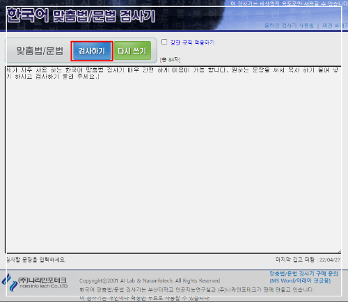 접속 후 자유롭게 이용할 수 있습니다. 한 문장 검사 후 다시 검사 할 때는 다시 쓰기를 누르시고 이용하시면 됩니다.